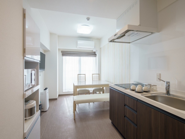 シングルルーム同様の備品の他に、IHコンロ付きのキッチンもあるのでお料理もお楽しみいただけます。