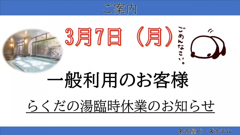 - 3月7日(月) 【一般利用】らくだの湯臨時休業のお知らせ
